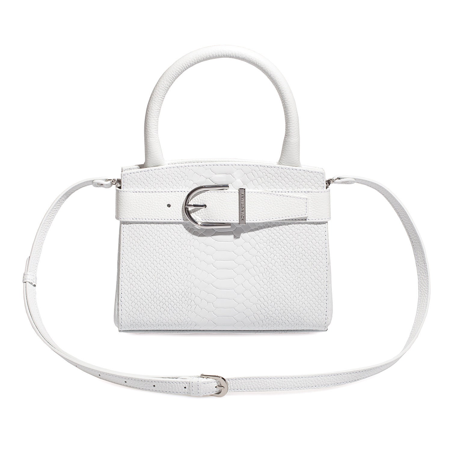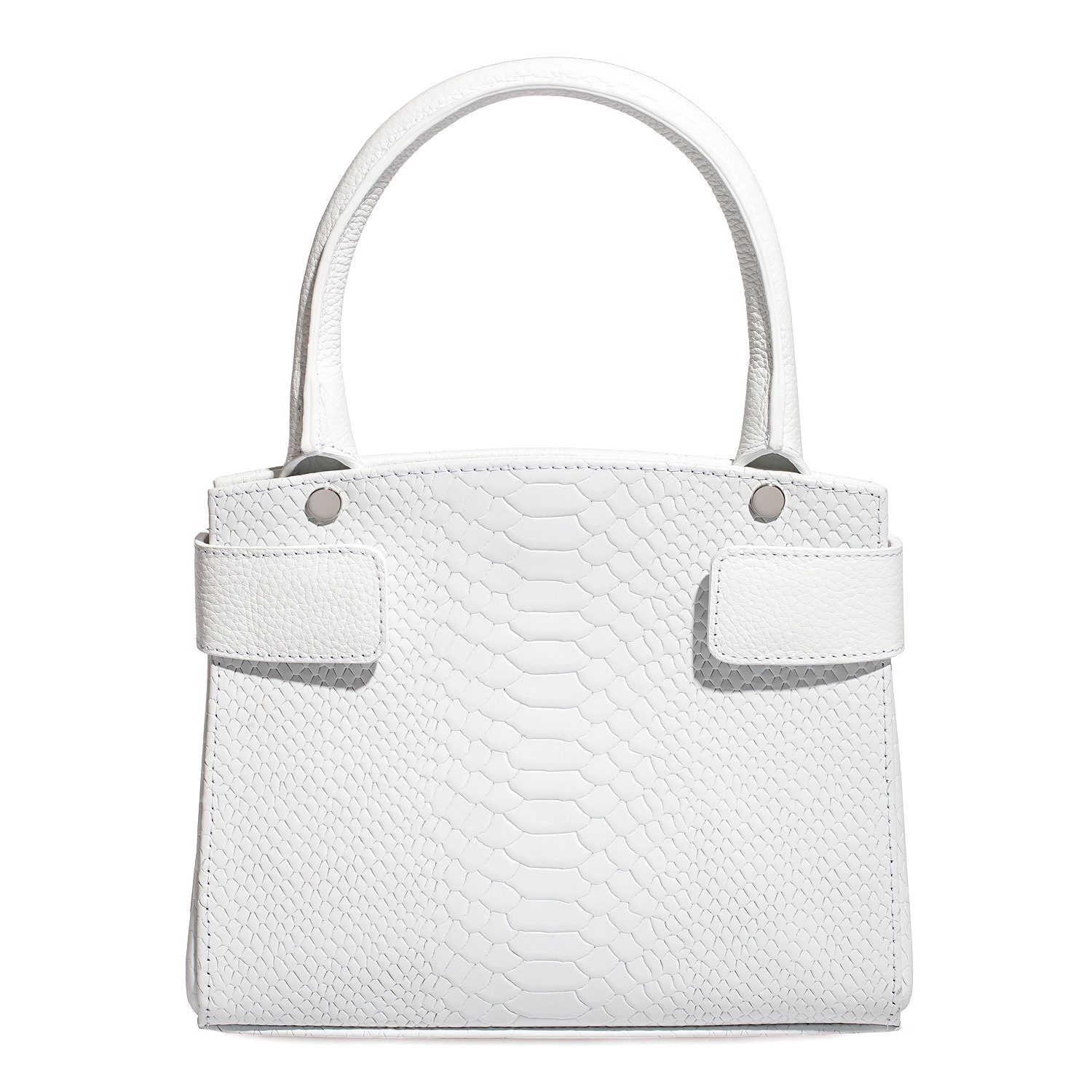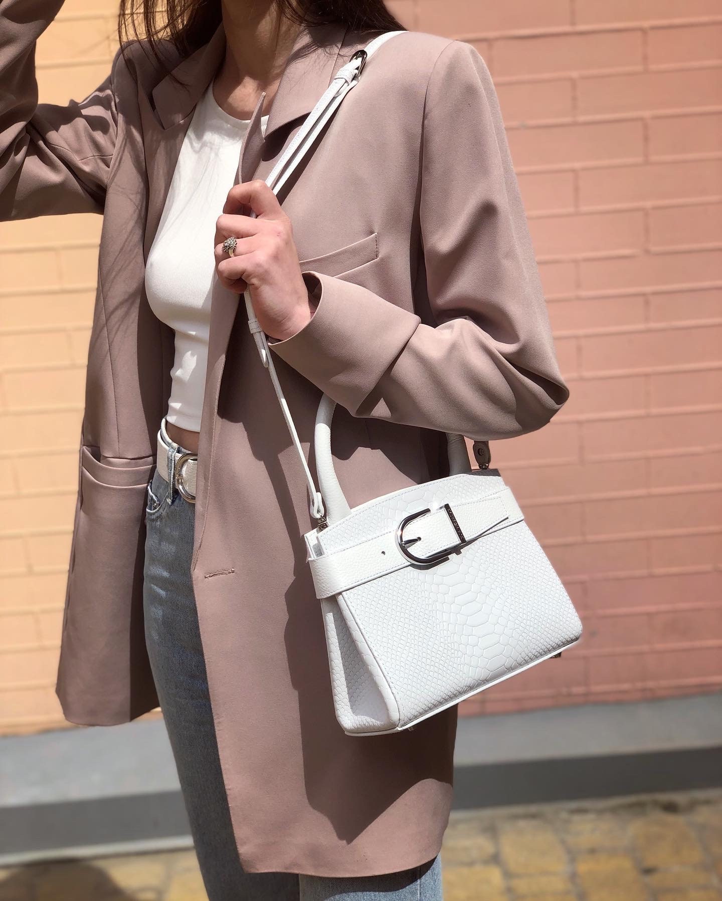 Women's leather bag made of genuine leather, hardware with galvanic coating and microfiber lining. The internal space of a bag is equipped with three compartments, one compartment and two side pockets, one with a zipper. §³loses with 3 magnet buttons. The bottom of the bag is protected with metal legs. There is a long handle that allows you to wear the bag on the shoulder. The kit also includes a storage bag.