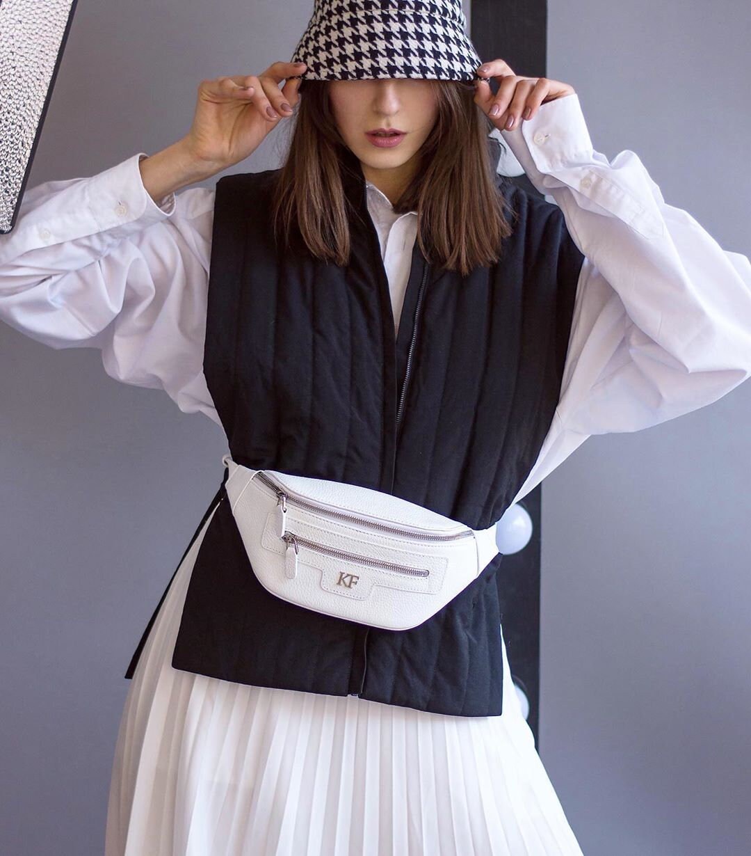 White genuine leather woman bananka bag from ukrainian designer Katerina Fox. Fashionable and elegant modern bag KF for bright girls and women. This bag is able to attract attention and highlight your exquisite taste. Inside the bag is one large compartment and a convenient zippered pocket for small items, closes the bag on the zipper.