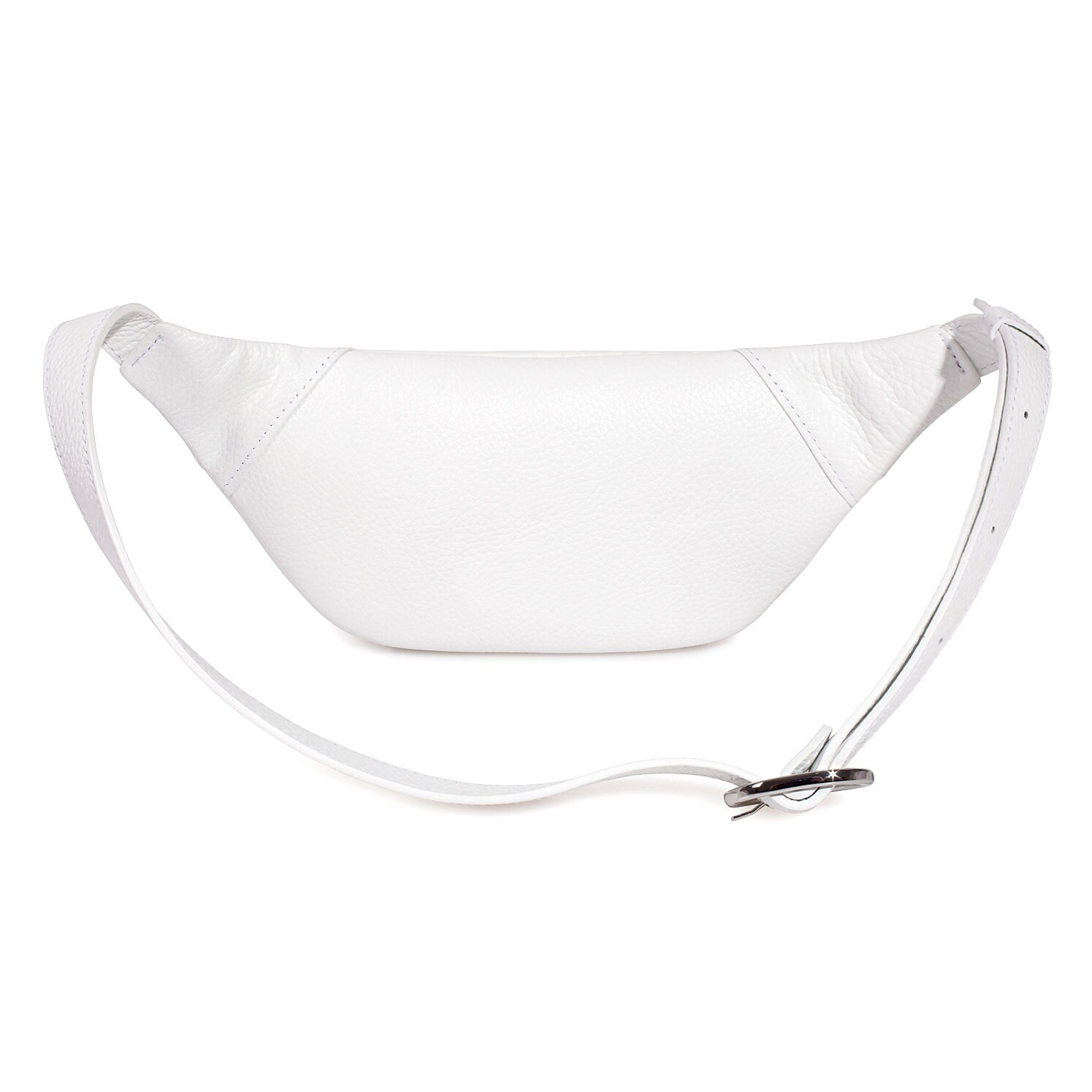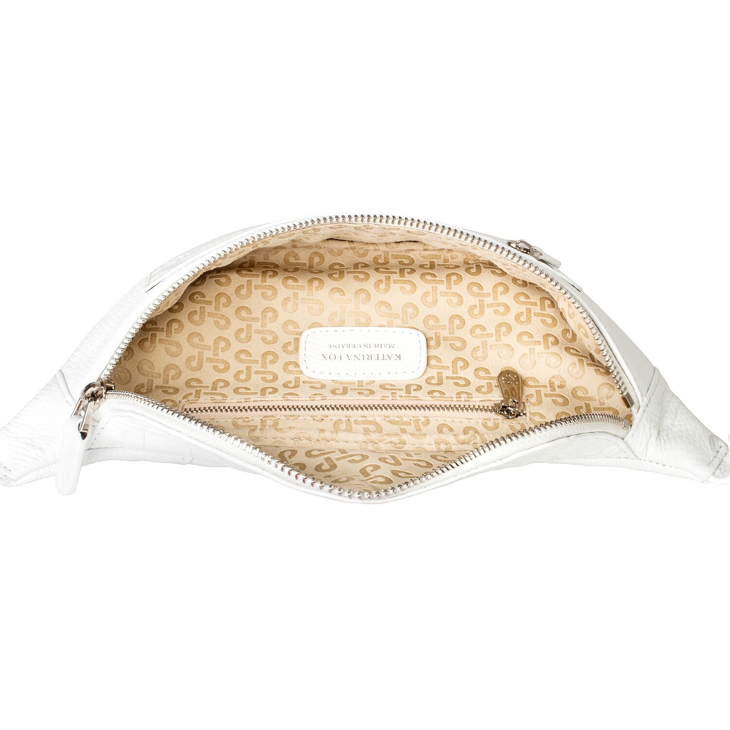 White genuine leather woman bananka bag from ukrainian designer Katerina Fox. Fashionable and elegant modern bag KF for bright girls and women. This bag is able to attract attention and highlight your exquisite taste. Inside the bag is one large compartment and a convenient zippered pocket for small items, closes the bag on the zipper.